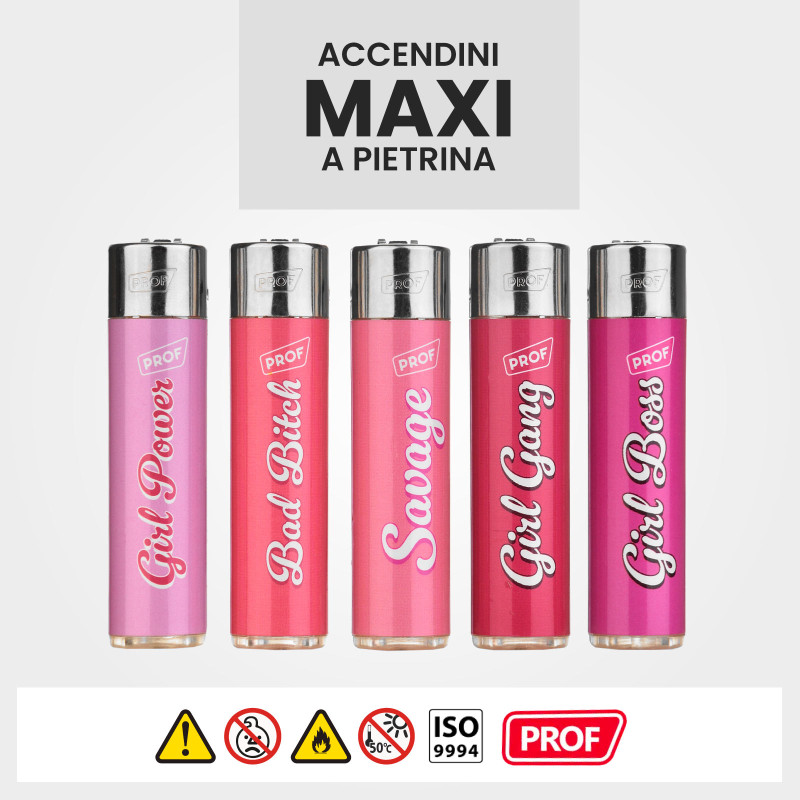 Accendini Prof maxi con fantasia Pink Girl in 5 varianti. Accendini ricaricabili e conformi EN - ISO. Accensione a pietrina. Fiamma non regolabile. Meccanismo Child-Resistant di sicurezza. Serie da 5 accendini.