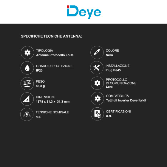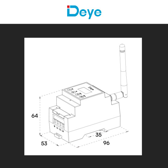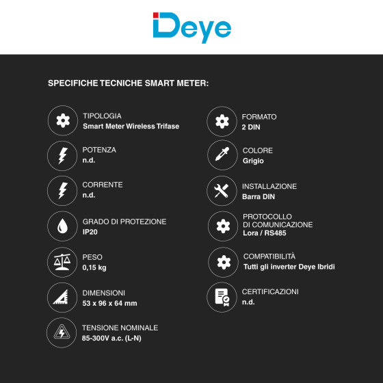 Contatore di energia elettrica per impianti fotovoltaici monofase e trifase e antenna protocollo LoRa. Smart Meter dotato di CT esterni. Con doppia comunicazione wireless LoRa e cablata RS485. Tensione nominale: AC 85-300V. Grado di protezione IP20. Formato: 2 Modulo DIN. Dimensioni 53x96x64mm. Antenna protocollo per il collegamento di inverter ibridi con i dispositivi LoRa. Formato: Plug RJ45. Dimensioni: 137,8x31,3x31,3mm