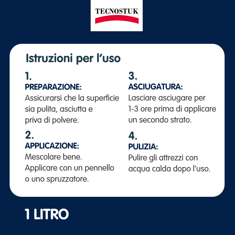 Tecnostuk Freddo Stop rivestimento termoisolante liquido pronto all'uso per pareti e soffitti. Crea una barriera termica contro il freddo, mantenendo il calore domestico in inverno e respingendo il calore del sole in estate. Grazie al suo nuovo sistema a nano-reticolo siliceo con alto coefficiente termico conferisce un ottimo isolamento con uno strato coibentante. Ha una resa di 7m² con un litro. Questo minicappotto rapido consente un maggior comfort termico nell'abitazione e un sostanzioso risparmio sui costi energetici, senza influire sulla traspirazione dei muri. MODALITÀ D'USO CONSIGLI FORMATO