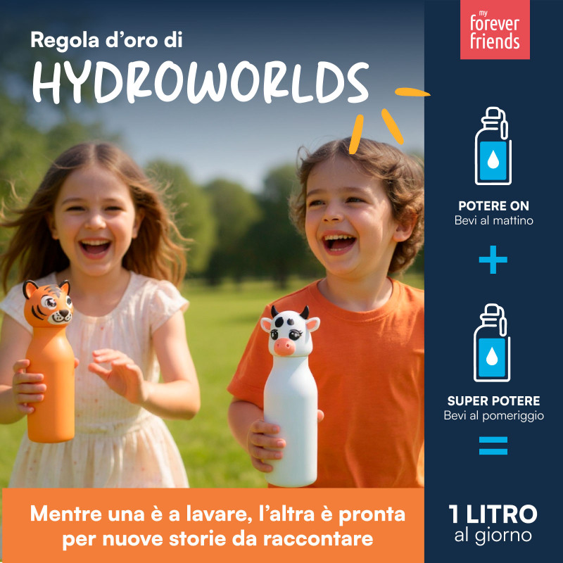Borraccia termica riutilizzabile per bambini, con forma ergonomica e tappo ispirato al mondo animale nella fantasia Tigre Tiger Teo. Ogni tappo è intercambiabile e racconta un beneficio dell’acqua attraverso una mini-storia (illustrata nelle immagini), senza bisogno di app ma solo con l’immaginazione. Con 2 borracce CapsHero, il bambino può leggere o intrecciare storie diverse durante la giornata, raggiungendo facilmente il fabbisogno idrico scolastico. Mentre una è in uso, l’altra è a lavare, e cresce la collezione dei 9 eroi con infinite combinazioni di storie. Formato kid-size, ideale per mani piccole e perfetta per lo zaino. Con la prima borraccia al mattino si attiva un potere, con la seconda al pomeriggio se ne scopre un altro: bere diventa un’avventura quotidiana. CARATTERISTICHE |