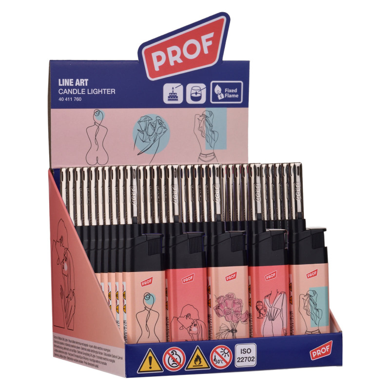 Accendigas Prof grandi con fantasia Line Art in 5 varianti. Accendini ricaricabili e conformi EN - ISO, dotati di bacchetta rigida. Accensione elettronica. Fiamma non regolabile. Ideali per casa, barbecue e grill. Box da 50 accendini.