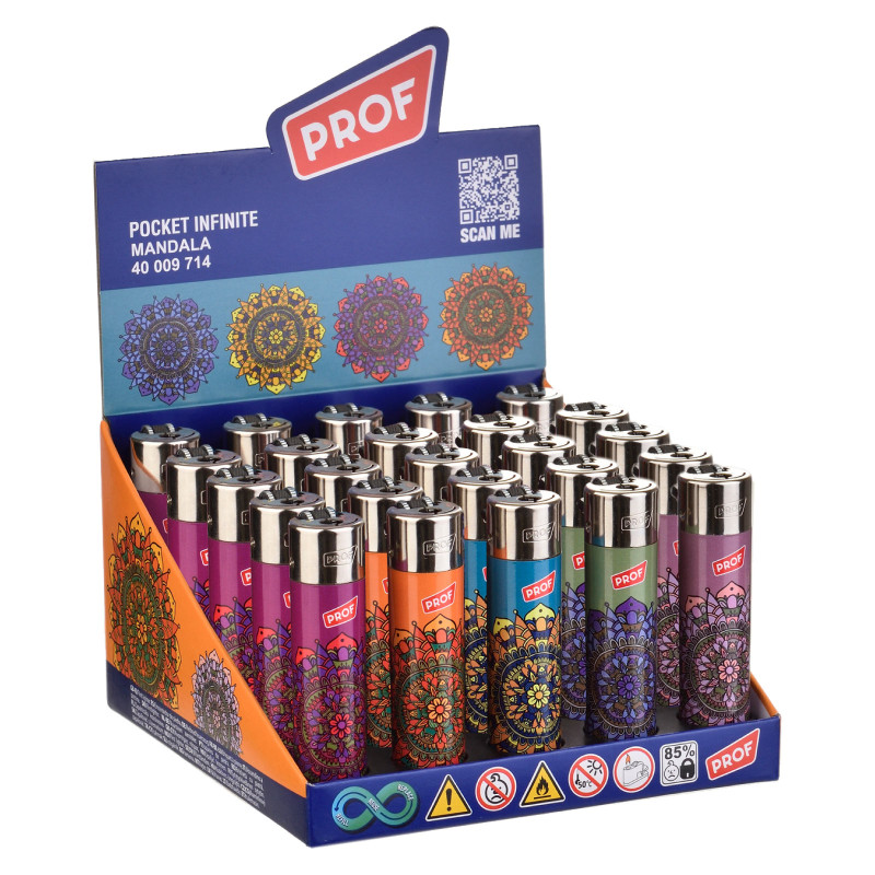 Accendini Prof maxi con fantasia Mandala in 5 varianti. Accendini ricaricabili e conformi EN - ISO. Accensione a pietrina. Fiamma non regolabile. Meccanismo Child-Resistant di sicurezza. Box da 25 accendini.