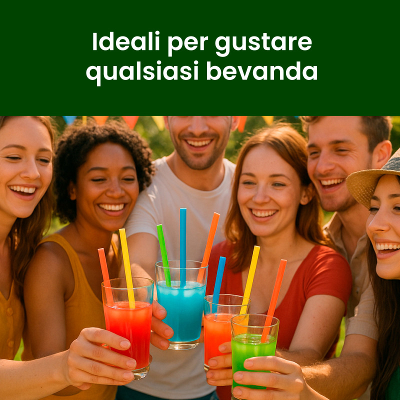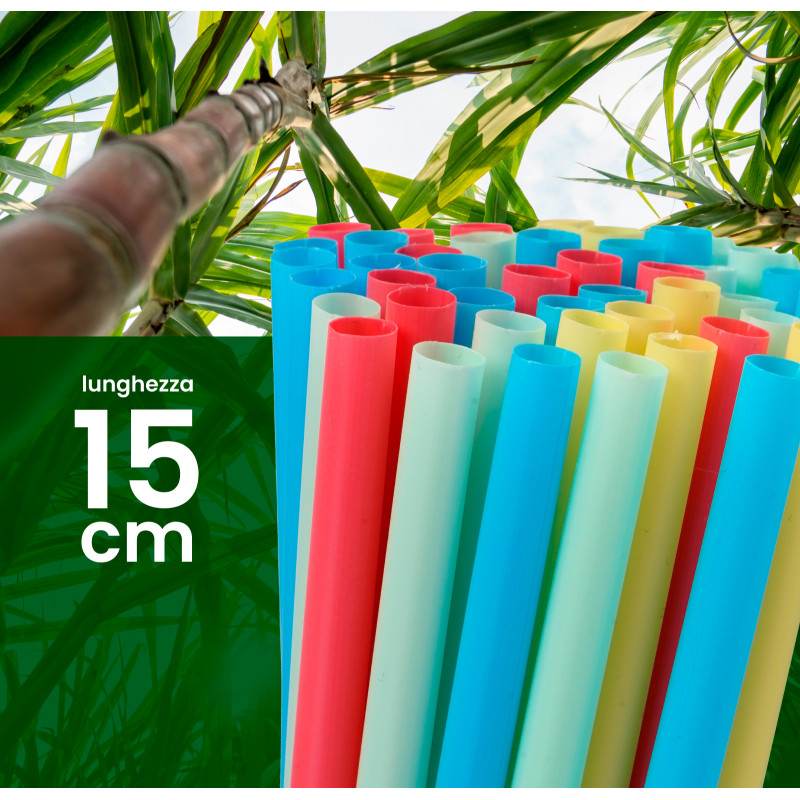 Cannucce 100% compostabili e biodegradabili realizzate in PLA. Non alterano il sapore delle bevande e garantiscono un'affidabilità superiore rispetto alla carta o alla plastica. Idonee al contatto con gli alimenti. Dimensioni Ø8mm x 15cm. Confezione da 50 cannucce in colori assortiti.