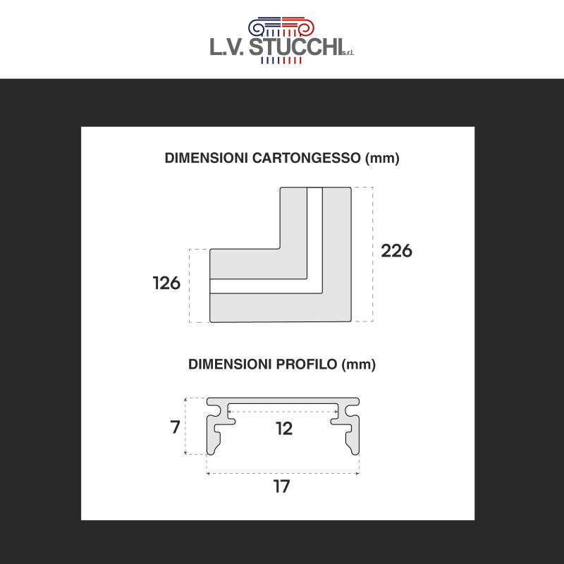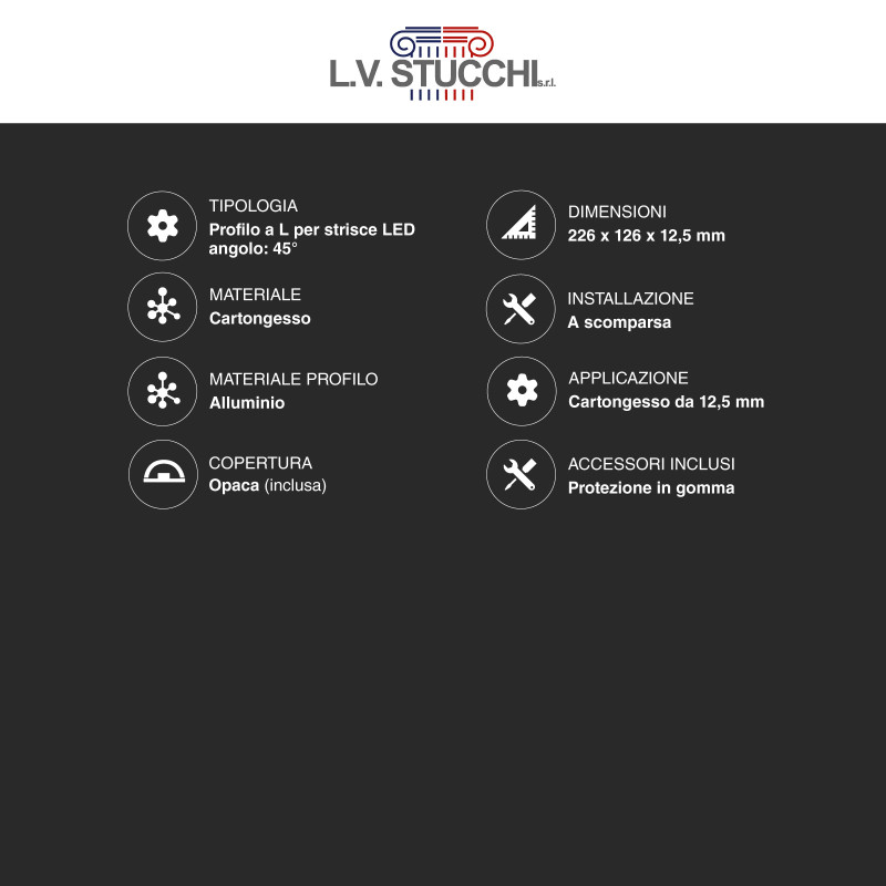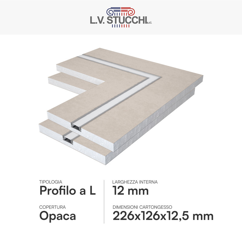 Profili a L per strisce LED integrati nel cartongesso. Corpo in alluminio e copertura opaca. Angolo di 45°. Adatto a tutti i tipi di strisce con larghezza fino a 12mm. Facile da installare direttamente sul montante. Guarnizione per stucco inclusa. Dimensioni cartongesso: 226x126x12,5mm. Dimensioni profilo: 17x7mm.