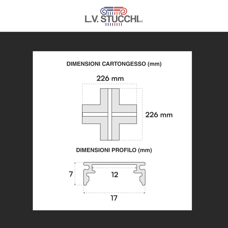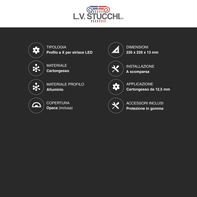 Profili a X per strisce LED integrati nel cartongesso. Corpo in alluminio e copertura opaca. Adatto a tutti i tipi di strisce con larghezza fino a 12,5mm. Facile da installare direttamente sul montante. Guarnizione per stucco inclusa. Dimensioni cartongesso: 226x226x13mm. Dimensioni profilo: 17x7mm.