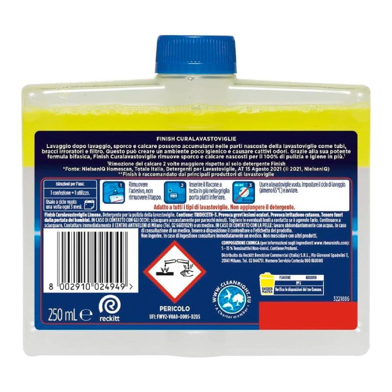 Trattamento che favorisce la manutenzione della lavastoviglie. Neutralizza la presenza di cattivi odori, rimuove il calcare e pulisce le parti più nascoste come tubi, bracci irroratori e filtro. Igienizza e pulisce l'ambiente grazie alla sua formula bifasica. Da utilizzare una volta ogni tre mesi a ciclo vuoto, senza aggiungere il detergente. Fragranza Limone. 1 Flacone da 250ml