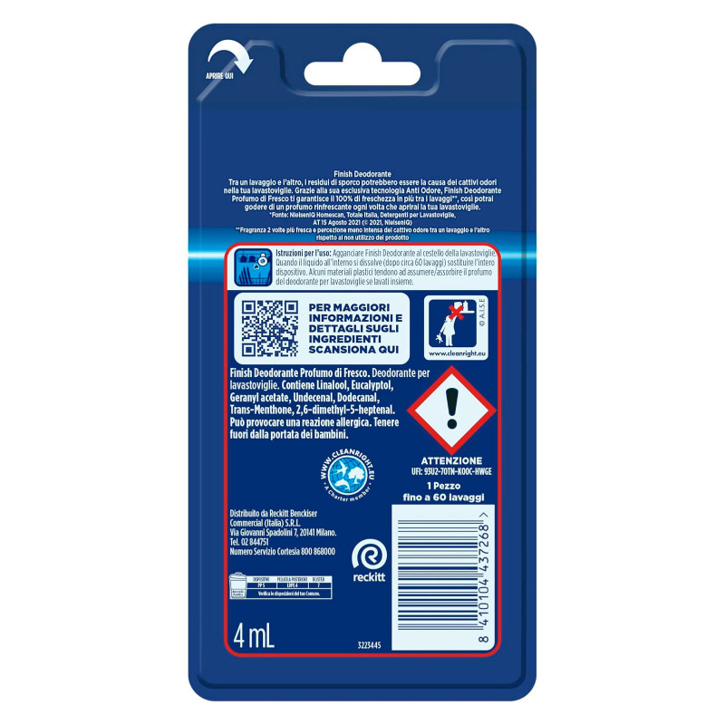 Finish Deodorante per Lavastoviglie con fragranza di limone e lime, elimina gli odori sgradevoli tra un lavaggio e un altro e rilascia un piacevole profumo. Con tecnologia Anti Odore che garantisce freschezza fino a 60 lavaggi. MODALITÀ D’USO