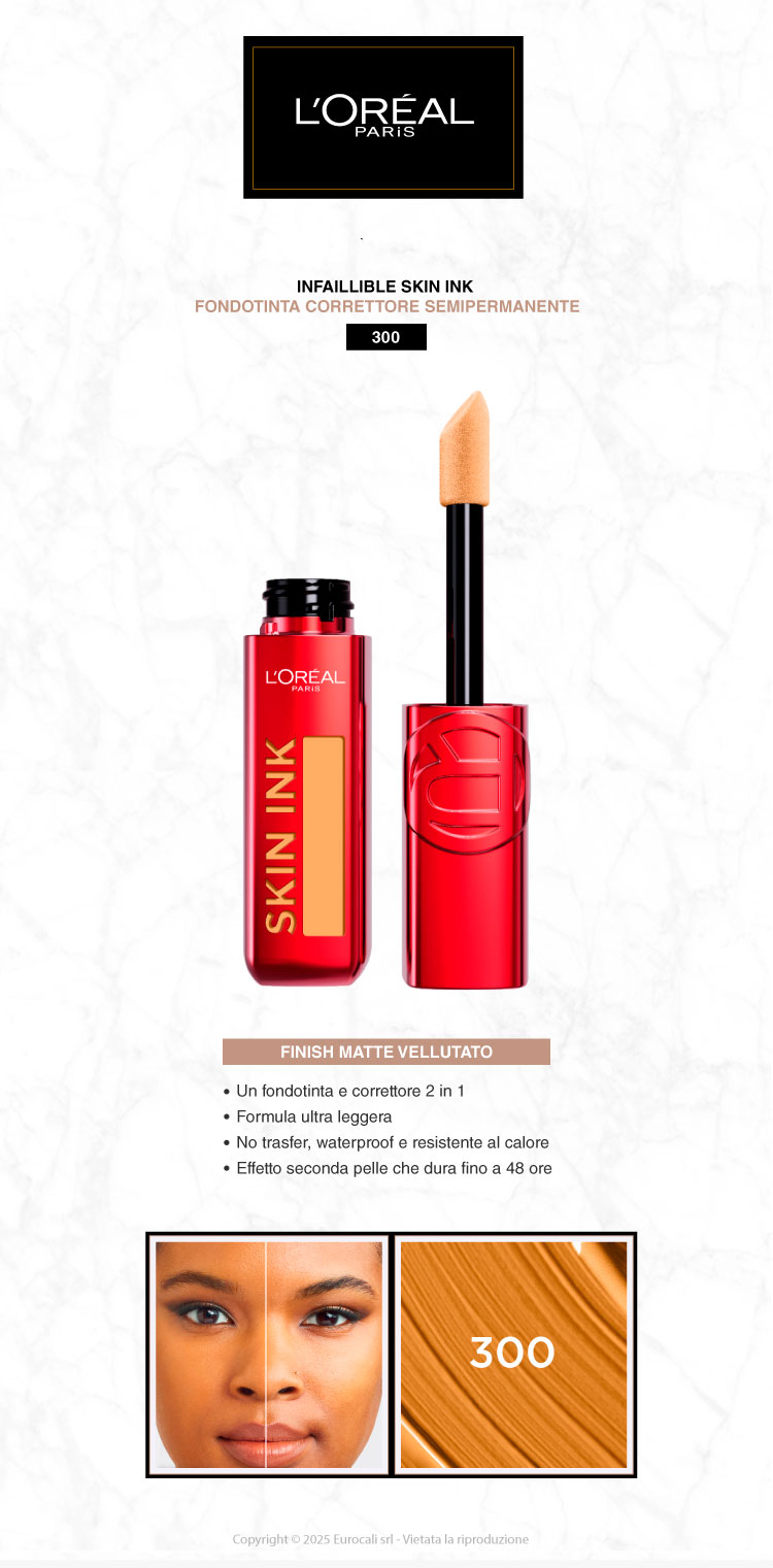 L'Oréal Paris Skin Ink fondotinta correttore 2in1 semipermanente a lunga durata, fino a 48h. Resiste a sudore e calore. FORMULA MODALITÀ D'USO COLORAZIONE FORMATO |