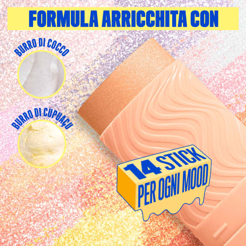 Illuminante in stick dalla texture cremosa e a lunga tenuta, fino a 8 ore. Ideale per ottenere un effetto glow luminoso e uniforme. Versatile per viso e corpo su clavicole, braccia e gambe. Formula vegana arricchita con burro di cupuaçu e cocco. Tonalità 06 A Whole Melt.