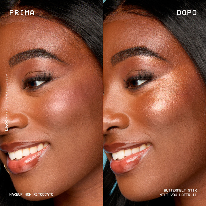 NYX Professional Makeup Buttermelt Stix illuminante in stick a lunga tenuta fino a 8 ore. Texture cremosa che si fonde perfettamente con la pelle per un effetto glow luminoso e uniforme. Gli angoli inclinati dello stick consentono un'applicazione precisa e mirata su viso e corpo FORMULA MODALITÀ D'USO COLORAZIONE |