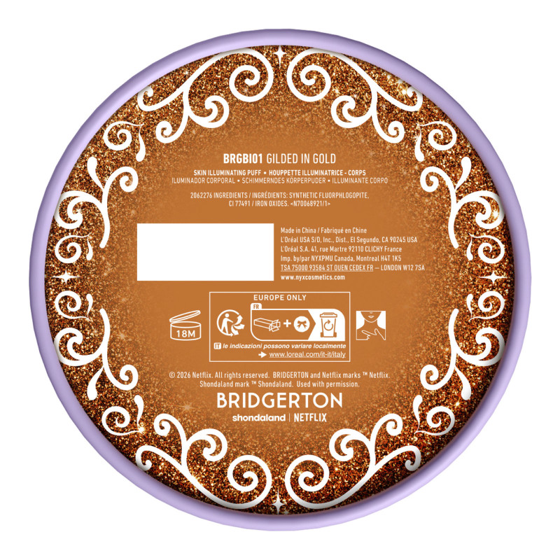 NYX Professional Makeup Bridgerton Royal Shimmer Puff Illuminante modulabile per un bagliore dorato su viso, collo e décolleté. Applicatore puff integrato per un finish luminoso a effetto soft focus che valorizza ogni tono di pelle. FORMULA MODALITÀ D'USO COLORAZIONE |