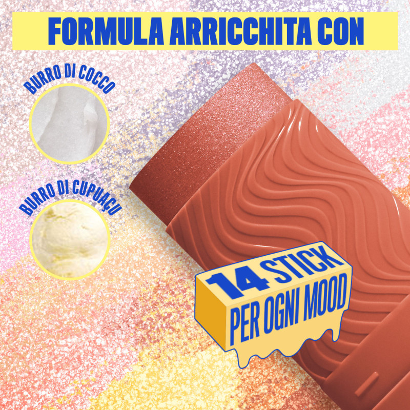 Illuminante in stick dalla texture cremosa e a lunga tenuta, fino a 8 ore. Ideale per ottenere un effetto glow luminoso e uniforme. Versatile per viso e corpo su clavicole, braccia e gambe. Formula vegana arricchita con burro di cupuaçu e cocco. Tonalità 07 That's on Melt.