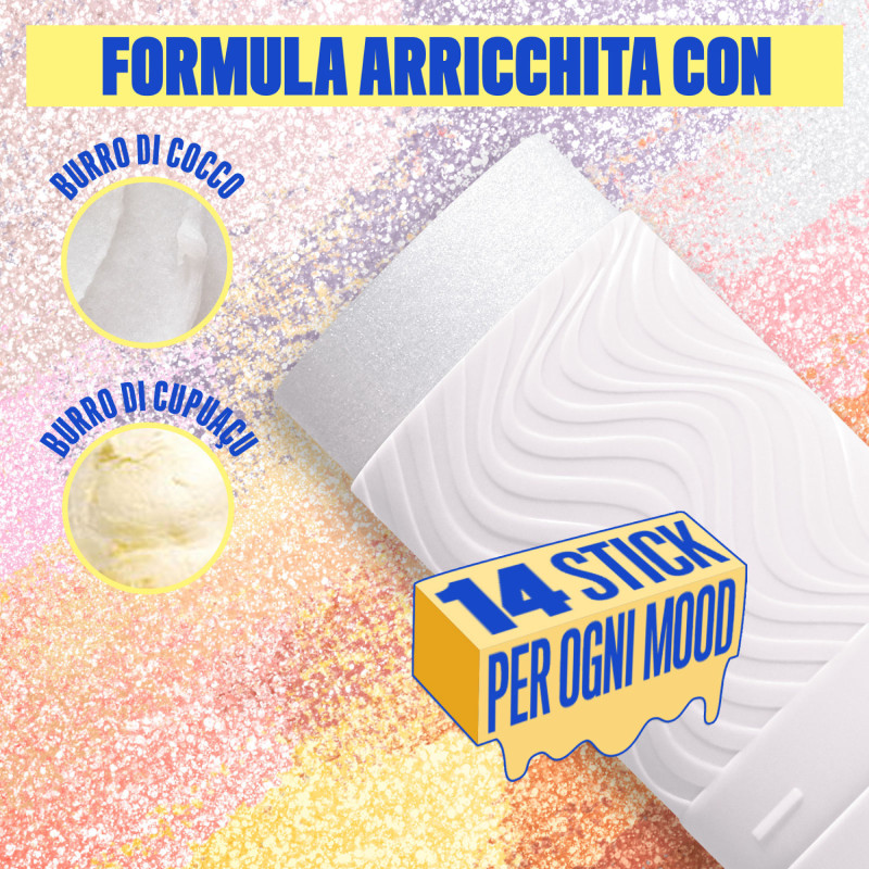 Illuminante in stick dalla texture cremosa e a lunga tenuta, fino a 8 ore. Ideale per ottenere un effetto glow luminoso e uniforme. Versatile per viso e corpo su clavicole, braccia e gambe. Formula vegana arricchita con burro di cupuaçu e cocco. Tonalità 03 That's so Melt.
