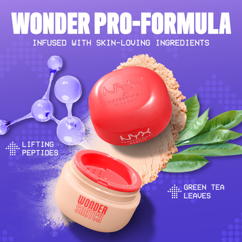 NYX Professional Makeup Wonder Snatch cipria in polvere libera fissante con texture vellutata e finish traslucido. Si sfuma facilmente e risulta leggera sulla pelle. Fino a 16 ore di tenuta, a prova di sudore. FORMULA MODALITÀ D'USO COLORAZIONE |