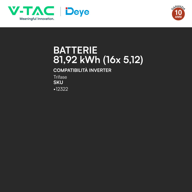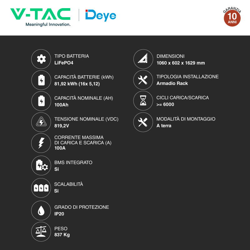Il kit comprende: 16 batterie impilabili, 1 modulo BMS e 1 doppio armadio rack. Ogni accumulatore LiFePO4 da 5,12kWh per inverter di impianti fotovoltaici ha una tensione di 819,2V e una capacità di 100Ah. Predisposto per l'installazione stack a terra tramite la doppia struttura inclusa. Grado di protezione IP20. Cicli di carica/scarica: ≥6000. Garanzia 10 anni. Dimensioni totali: 1060x602x1629mm. Peso totale: 837Kg.