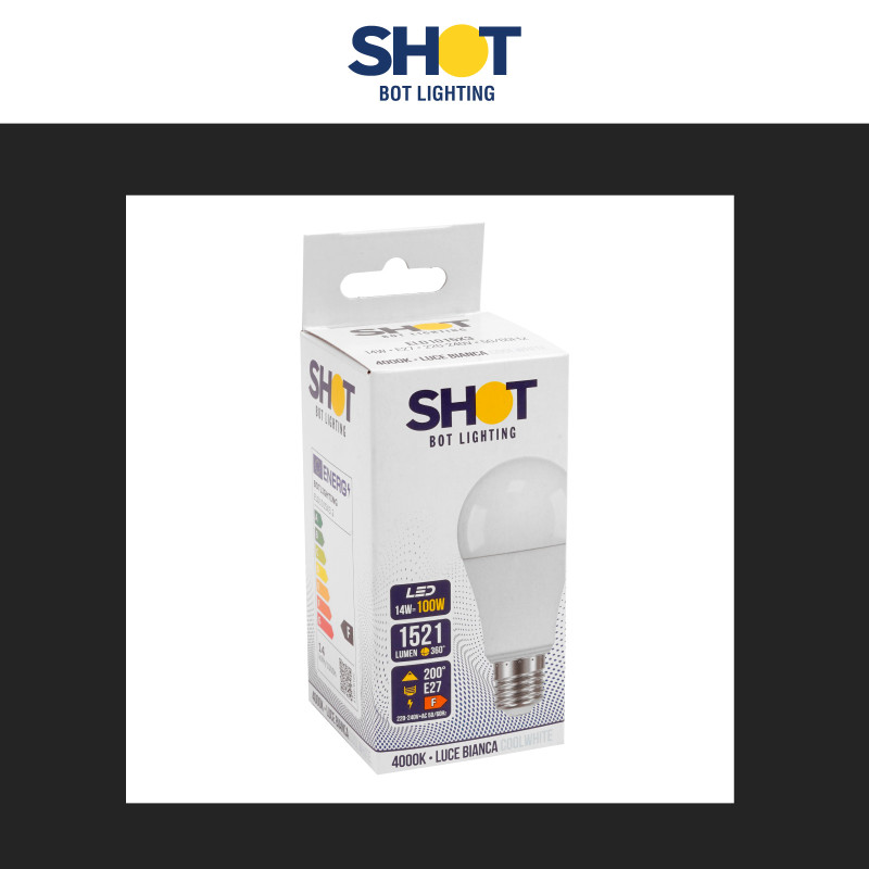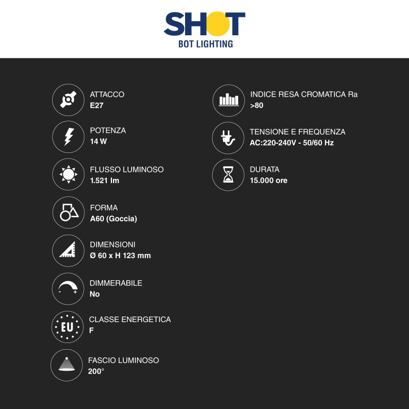 Lampadina LED SMD con attacco E27 e potenza di 14W. Forma a Goccia A60 in materiale termoplastico. Fascio luminoso di 200°, flusso luminoso di 1521 lm e alta luminosità con rapporto di 108 lm/W. Disponibile con: Luce Bianca Calda 2700K, Naturale 4000K e Fredda 6500K. Classe energetica F e resa cromatica >80. Dimensioni: Ø60x123mm.