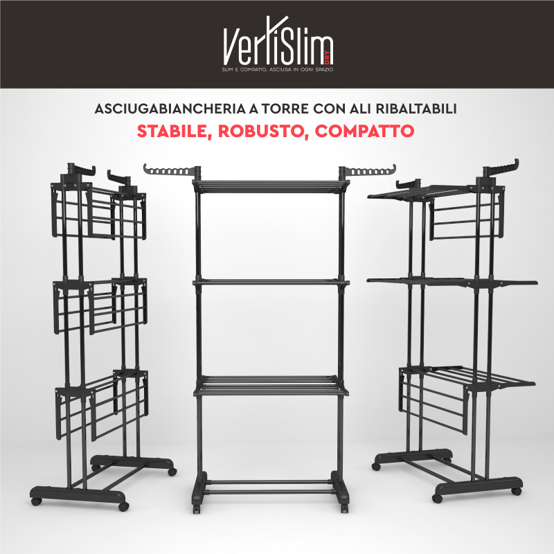 Stendibiancheria verticale slim a 4 livelli, di colore nero. Salvaspazio e richiudibile in poche mosse, può essere riposto in angoli stretti o dietro le porte. Facile da utilizzare e montare, è perfetto per famiglie e giovani in piccoli appartamenti che cercano un’organizzazione domestica più efficiente e minimal. Si sposta con facilità in ogni ambiente della casa ed è adatto sia per uso interno che esterno. Stabile e resistente, evita ribaltamenti e permette di stendere capi di ogni tipo come magliette, pantaloni, piumini, accappatoi e biancheria, garantendo una ventilazione e un'asciugatura ottimale. CARATTERISTICHE |