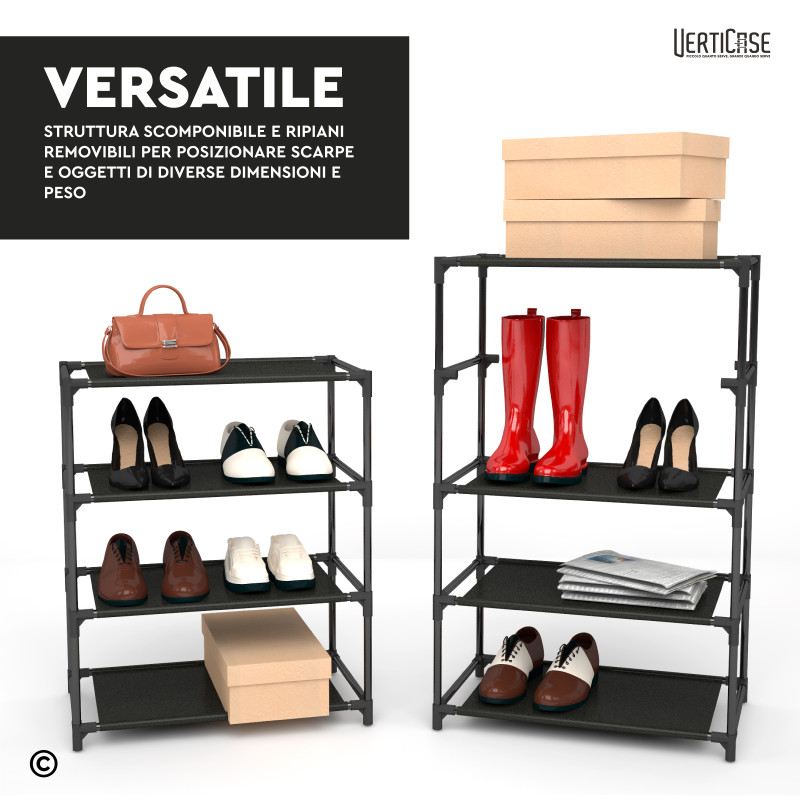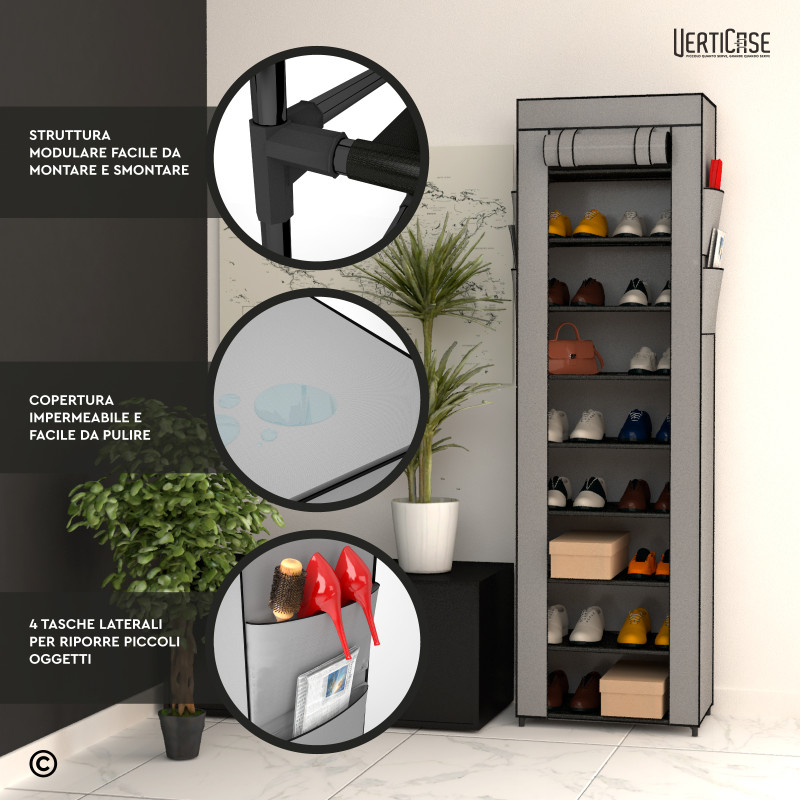 Scarpiera verticale slim salvaspazio, perfetta per tenere in ordine scarpe e accessori in ingresso, camera o cabina armadio. Ideale per chi vive in piccoli appartamenti o per chi vuole sfruttare spazi stretti senza rinunciare a stile e funzionalità. Facile da montare e smontare, la struttura è versatile e scomponibile con ripiani in tela robusti e removibili per posizionare scarpe e oggetti di diverse dimensioni e peso. Facile da pulire, protegge il contenuto e mantiene l’ambiente ordinato, permettendo un accesso rapido e sicuro alle scarpe. Dotata di tasche laterali per riporre anche piccoli oggetti come spazzole, libri, ciabatte o accessori. CARATTERISTICHE |