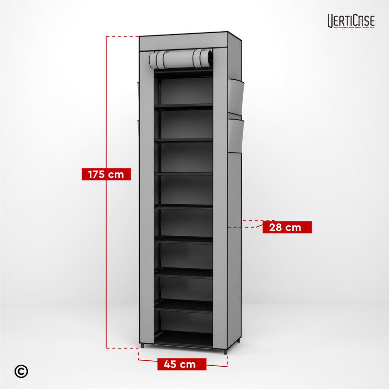 Scarpiera verticale grigia salvaspazio a 10 ripiani removibili, perfetta per tenere in ordine scarpe e accessori. Struttura versatile e scomponibile in metallo, con ripiani in tela robusti e removibili. Dotata di piedini antiscivolo e copertura in tela impermeabile e antipolvere. Chiusura a zip e anta avvolgibile per un accesso rapido e sicuro alle scarpe e 4 tasche laterali per riporre anche piccoli oggetti. Dimensioni: 45x175x28cm.