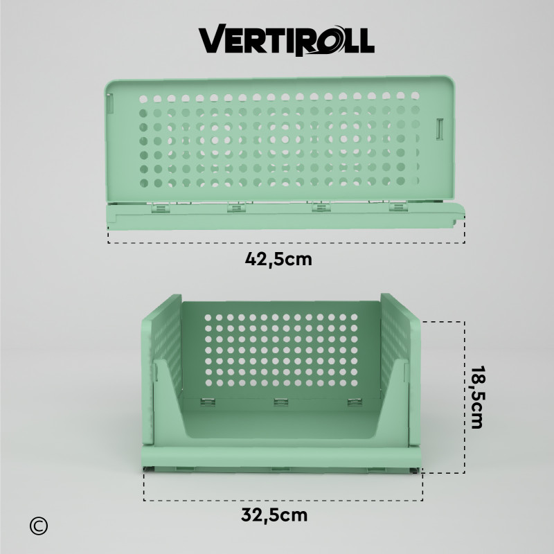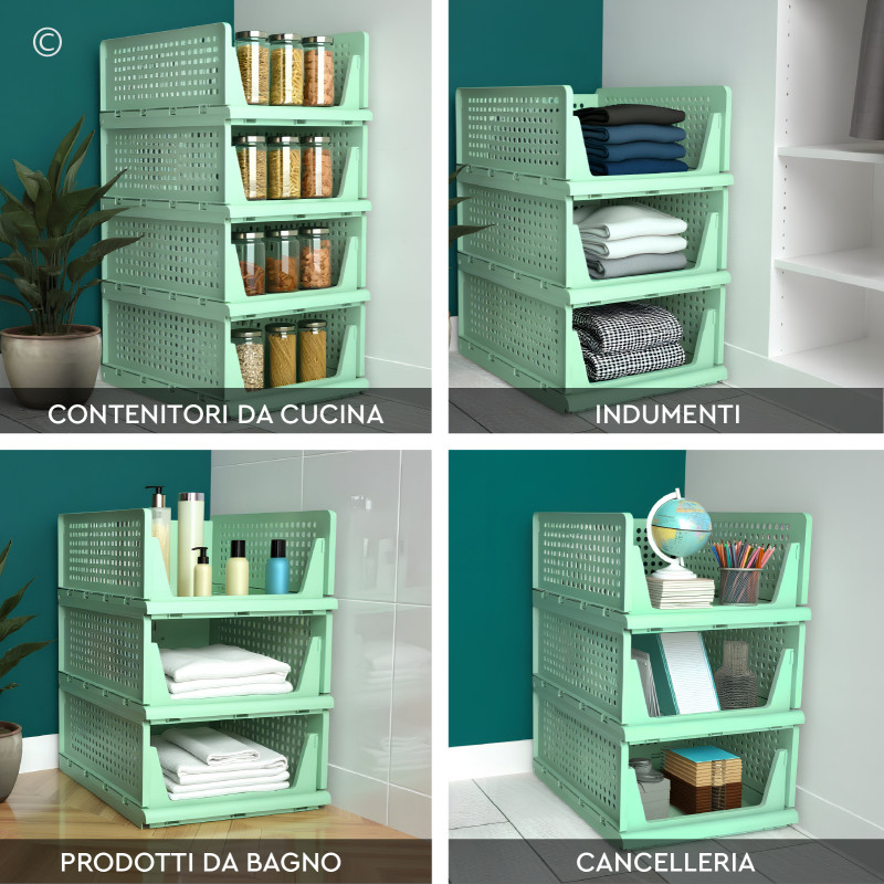 Organizer composto da 4 cassetti impilabili di colore verde. Apertura frontale e scorrimento fino alla fine della guida, si adattano a qualsiasi spazio. Salvaspazio, impilabili e modulabili, ogni unità si combina con le altre per creare configurazioni su misura. Materiale in plastica lavabile e resistente all'umidità. Pieghevoli, leggeri e facili da montare. Fori di aerazione integrati. Dimensioni: 32,5x42,5x18,5cm.