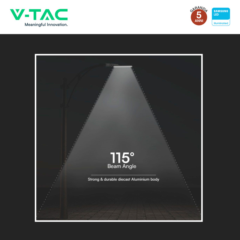 Lampione stradale LED SMD con chip Samsung e potenza di 150W. Corpo in alluminio di colore grigio. Fascio luminoso di 115°, flusso luminoso di 17220lm e ad alta luminosità con rapporto di 114 lm/W. Grado di protezione IP65. Diametro palo: Ø60mm. Classe energetica D e resa cromatica >70. Snodo integrato e angolo d’inclinazione regolabile fino a 180°. Disponibile con: Luce Bianca Naturale 4000K. Garanzia 5 anni. Dimensioni: 628x99x203mm.
