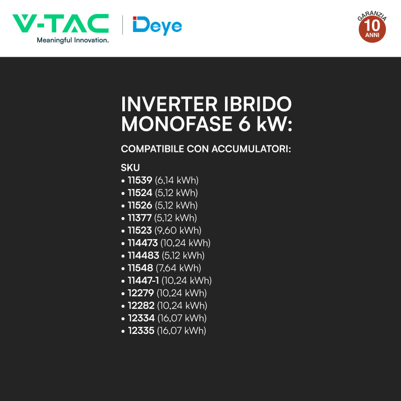 SPECIFICHE TECNICHE • Potenza: 6kW • Tipologia: Monofase • Ibrido: Sì • N. MPPT: 2 • Modulo Wi-Fi incluso: Sì • Potenza massima in ingresso DC: 7800W • Tensione in ingresso PV: 370 (125~500) • Tensione di avvio: 125V • Intervallo tensione MPPT: 150-425V • Potenza uscita massima AC: 6600W • Tipo batteria compatibile: Piombo-acido / ioni di litio • Intervallo tensione batteria: 40-80V • Corrente massima di carica: 135A • Corrente massima di scarica: 135A • Grado di protezione: IP65 • Sistema di monitoraggio: CT/TA • Smart Meter incluso: No • Dimensioni: 330 x 580 x 232 mm • Peso: 24 Kg • Colore: Nero • Certificazioni: CEI 0-21 • Garanzia: 10 anni • Dichiarazioni di conformità: IEC/EN 61000-6-1/2/3/4, IEC/EN 62109-1, IEC/EN 62109-2