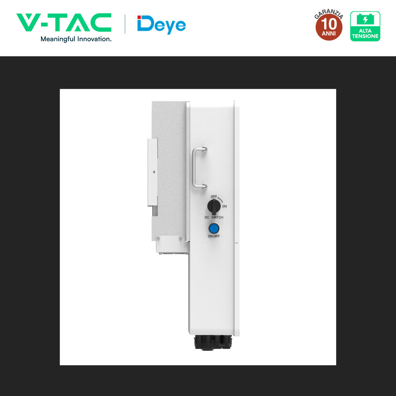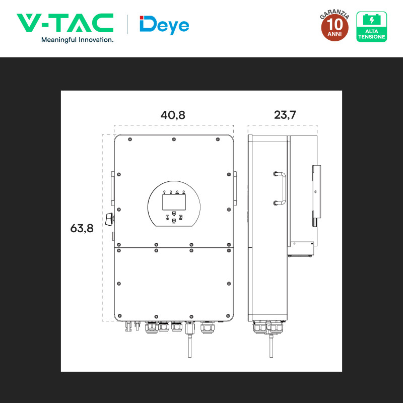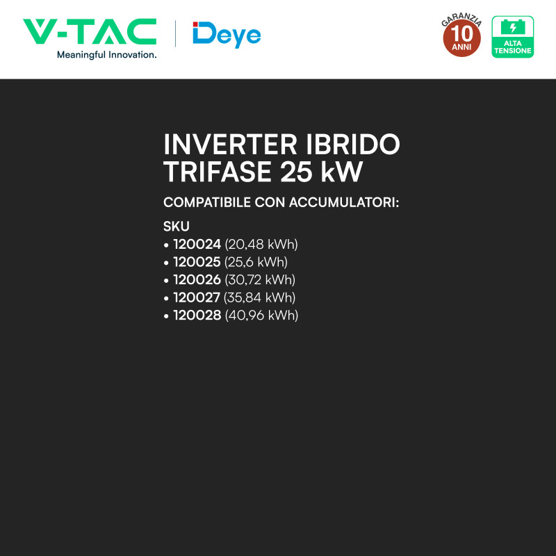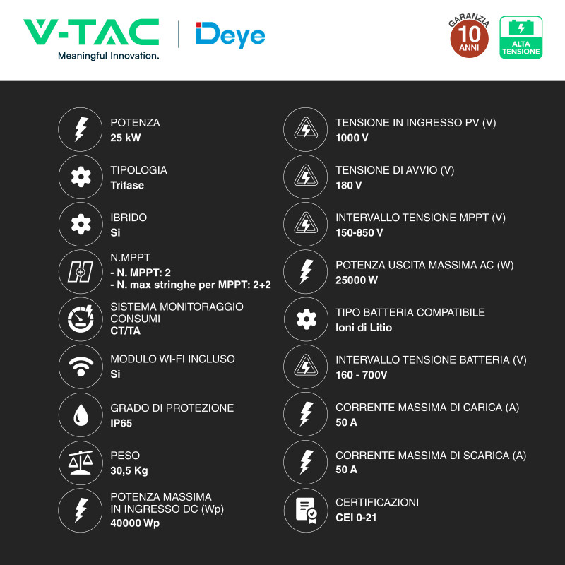 Inverter ibrido On-Grid/Off-Grid per pannelli solari di impianti fotovoltaici industriali. Sistema trifase, potenza di 25kW e tensione in ingresso di 1000V. Potenza max in ingresso (totale pannelli collegabili): 40000Wp. Predisposto per l'installazione a parete, grado di protezione IP65 per uso esterno. Compatibile con batterie ad alta tensione. Inclusi accessori per l'installazione e modulo Wi-Fi. Colore nero. Dimensioni: 408x638x237mm. Peso: 30,5Kg.