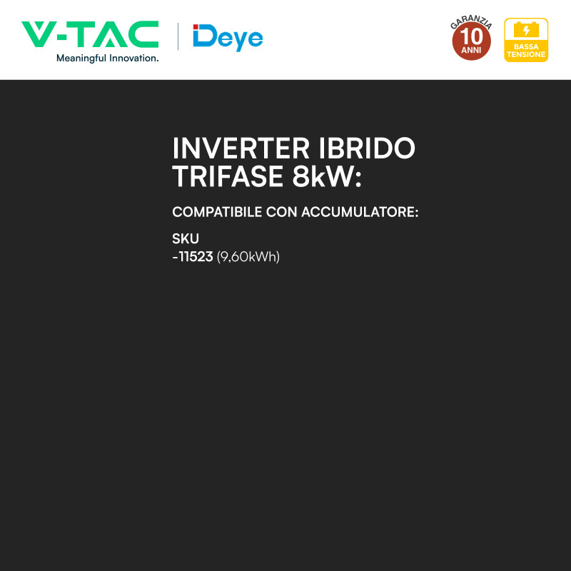 Inverter ibrido On-Grid/Off-Grid per pannelli solari di impianti fotovoltaici commerciali. Sistema trifase, potenza di 8kW e tensione in ingresso di 800V. Potenza max in ingresso (totale pannelli collegabili): 12800Wp. Predisposto per l'installazione a parete, grado di protezione IP65 per uso esterno. Compatibile con batterie a bassa tensione. Inclusi accessori per l'installazione e modulo Wi-Fi. Dimensioni: 386x660x250mm. Peso: 35,2Kg.
