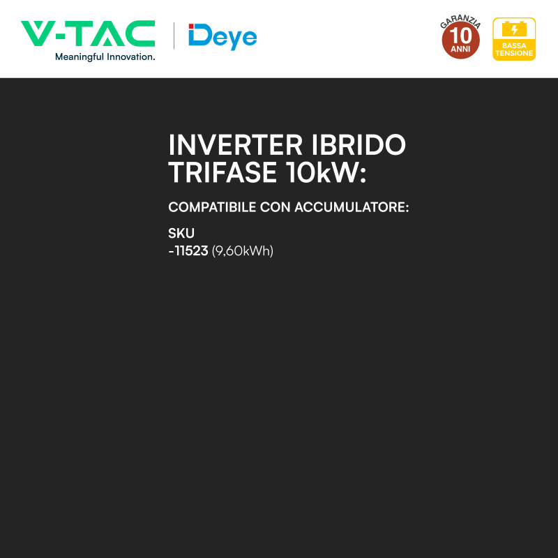 Inverter ibrido On-Grid/Off-Grid per pannelli solari di impianti fotovoltaici industriali. Sistema trifase, potenza di 10kW e tensione in ingresso di 800V. Potenza max in ingresso (totale pannelli collegabili): 16000Wp. Predisposto per l'installazione a parete, grado di protezione IP65 per uso esterno. Compatibile con batterie a bassa tensione. Inclusi accessori per l'installazione e modulo Wi-Fi. Dimensioni: 386x660x250mm. Peso: 35,2Kg.