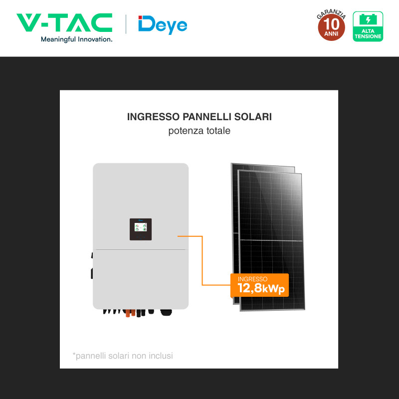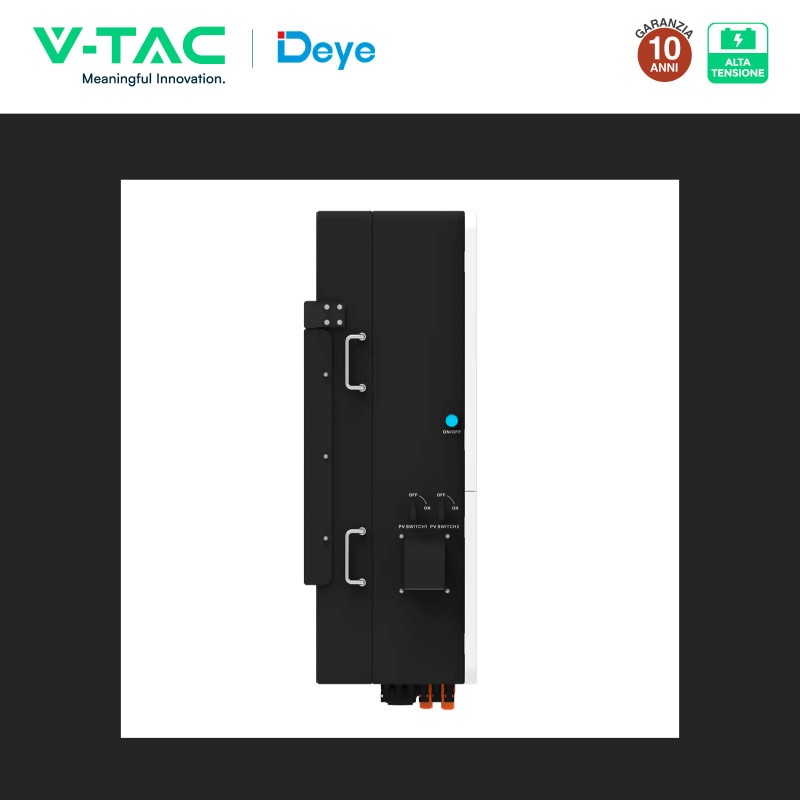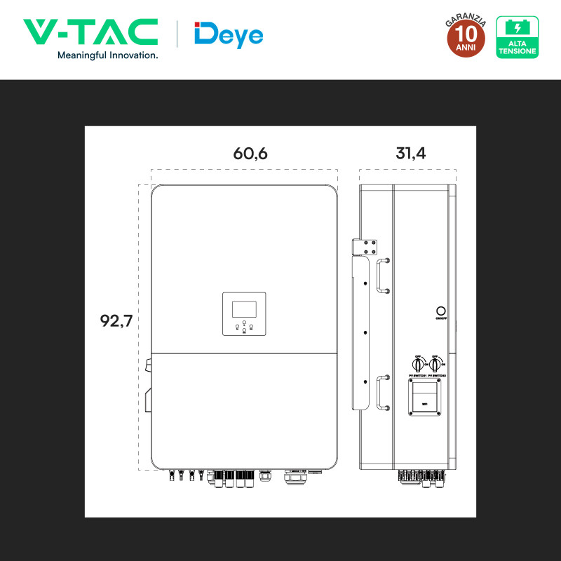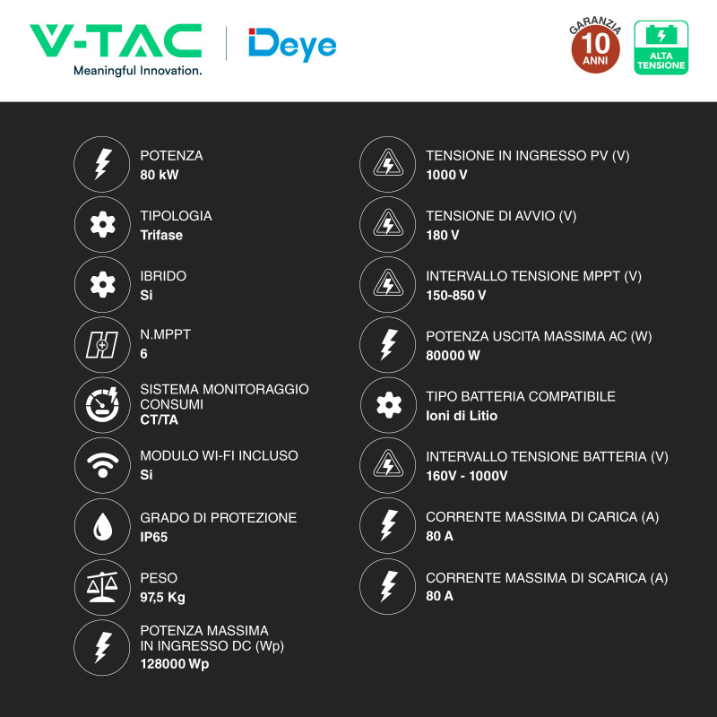 Inverter ibrido On-Grid/Off-Grid per pannelli solari di impianti fotovoltaici commerciali. Sistema trifase, potenza di 80kW e tensione in ingresso di 1000V. Potenza max in ingresso (totale pannelli collegabili): 128000Wp. Predisposto per l'installazione a parete, grado di protezione IP65 per uso esterno. Compatibile con batterie ad alta tensione. Inclusi accessori per l'installazione e modulo Wi-Fi. Dimensioni: 606x927x314mm. Peso: 97,5Kg.