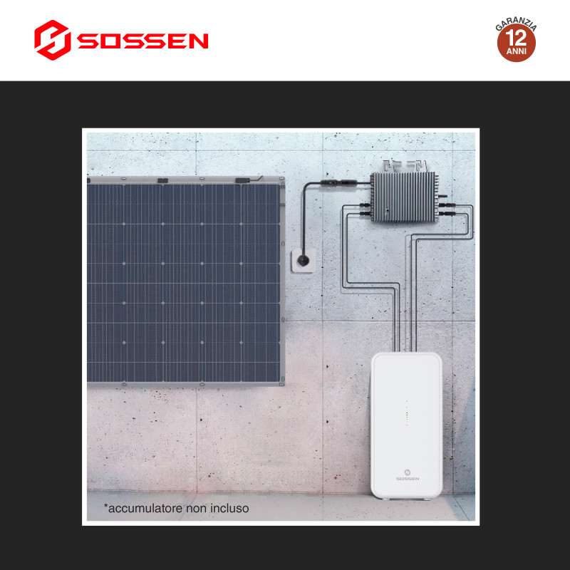 Microinverter On-Grid per sistemi fotovoltaici da balcone. Sistema monofase, potenza di 2400W e tensione in ingresso di 60V. Potenza max in ingresso (totale pannelli collegabili): 2800Wp. Predisposto per l'installazione a parete, grado di protezione IP67 per uso esterno. Modulo Wi-Fi integrato, accessori per l'installazione e cavo di alimentazione da 5m inclusi. Certificato CEI 0-21. Garanzia 12 anni. Dimensioni: 352x225x38,5mm. Peso: 5,5 Kg.