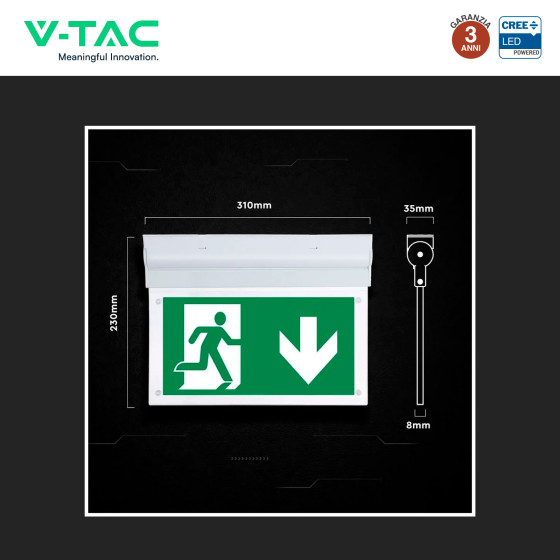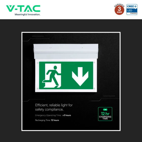 Lampada LED di emergenza con chip CREE e potenza di 2W. Flusso luminoso di 140 lm e rapporto di 70 lm/W. Modalità di funzionamento selezionabili: SA (sempre accesso) o SE (solo emergenza). Installazione 2in1 a parete o plafone. Batteria Ni-Cd da 3,6V e 900mAh, ricaricabile in 12 ore con autonomia di 3 ore. Corpo in materiale plastico di colore bianco con copertura trasparente. Grado di protezione IP20. Kit di fissaggio e 4 pittogrammi inclusi. Disponibile con: Luce Bianca Fredda 6000K. Garanzia: 3 anni. Dimensioni lampada: 310x230x35mm.
