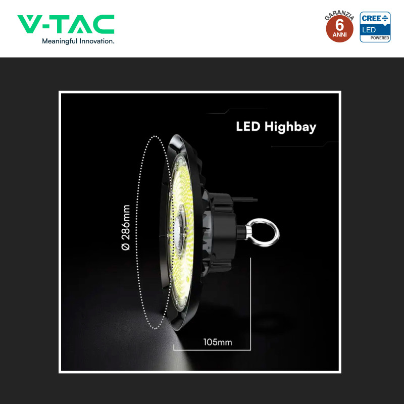Lampada LED Highbay rotonda a sospensione con potenza di 150W e tecnologia LED SMD con chip CREE. Fascio luminoso di 90° e flusso luminoso di 23250 lm. Alta luminosità e rapporto di 155 lm/W. Corpo in alluminio di colore nero e copertura trasparente. Grado di protezione IP65 per uso esterno. Driver e gancio per installazione a sospensione incorporati. Classe energetica D e resa cromatica >70. Disponibile con: Luce Naturale 4000K e Fredda 6500K. Dimensioni: Ø286x286x105mm.
