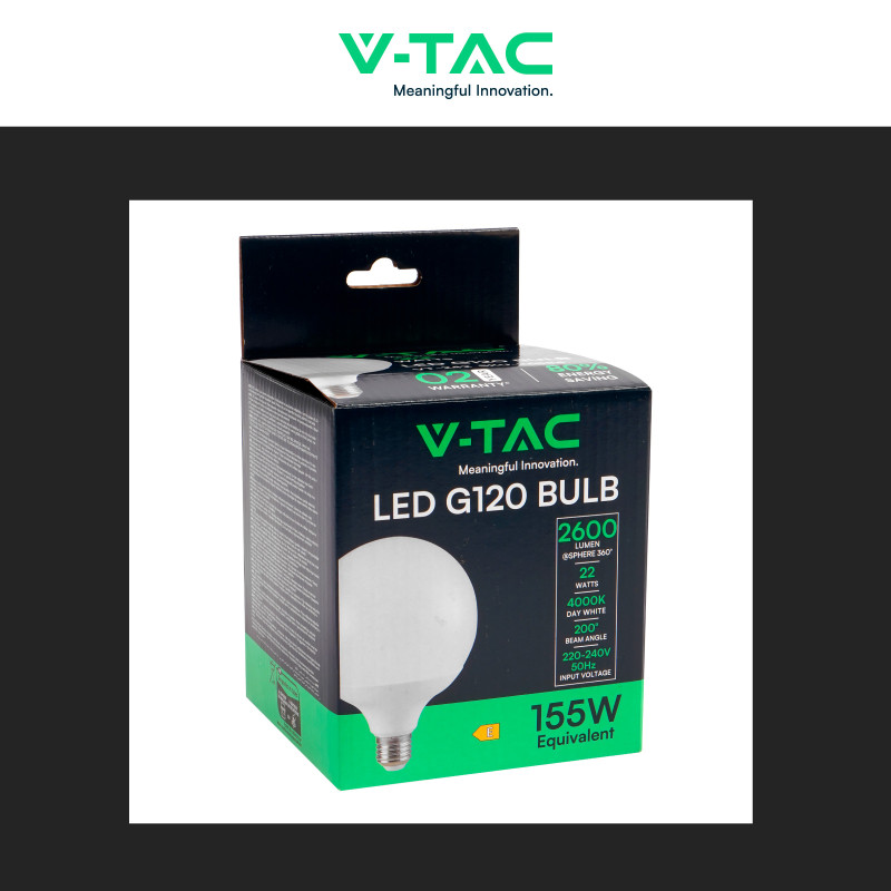 Lampadina LED SMD con attacco E27 e potenza di 22W. Forma Globo G120 in materiale termoplastico e copertura opaca. Fascio luminoso di 200°, flusso luminoso di 2600 lm e alta luminosità con rapporto di 118 lm/W. Disponibile con: Luce Bianca Calda 3000K, Naturale 4000K e Fredda 6500K. Classe energetica E e resa cromatica >80. Dimensioni: Ø120x160mm.