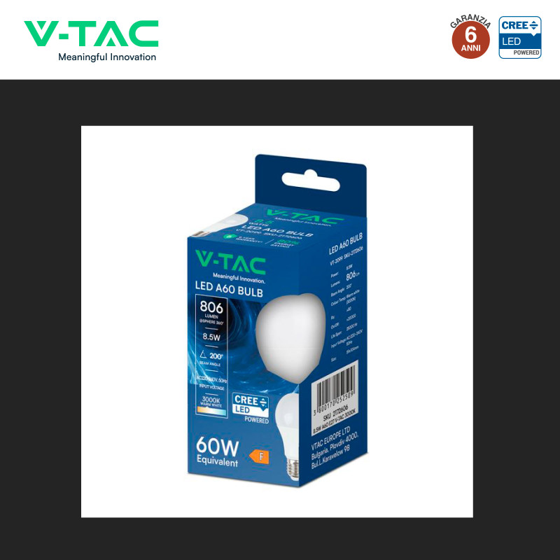 Lampadina LED SMD con chip CREE, attacco E27 e potenza di 8,5W. Forma a goccia A60 in materiale termoplastico e copertura opaca. Fascio luminoso di 200°, flusso luminoso di 806 lm e rapporto di 94 lm/W. Disponibile con: Luce Bianca Calda 3000K, Naturale 4000K e Fredda 6500K. Classe energetica F e resa cromatica >80. Garanzia: 6 anni. Dimensioni: Ø59x104mm.