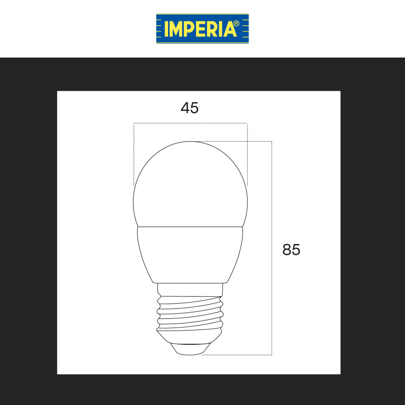 Lampadina LED SMD con attacco E27 e potenza di 9W. Forma MiniGlobo G45 in ceramica con copertura opaca. Flusso luminoso di 1100 lm e alta luminosità con rapporto di 122 lm/W. Disponibile con: Luce Bianca Calda 3000K e Naturale 4000K. Classe energetica E e resa cromatica 80. Dimensioni: Ø45x85mm.