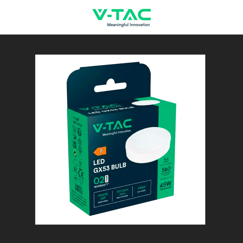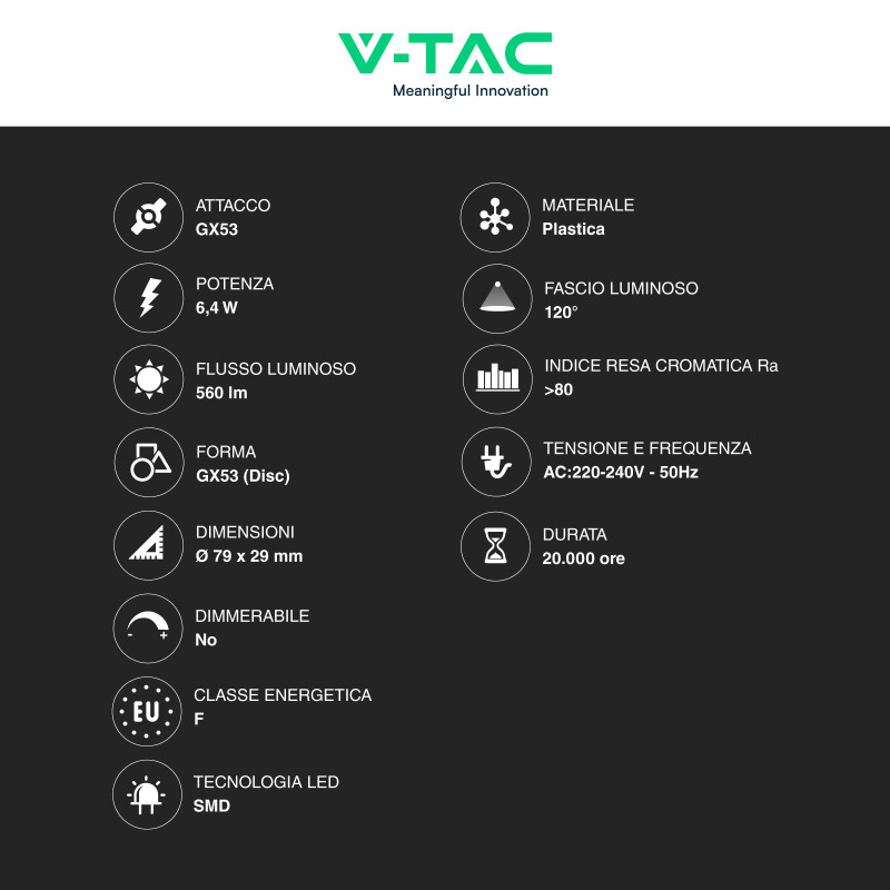 Lampadina LED SMD con attacco GX53 e potenza di 6,4W. Forma circolare a disco in materiale termoplastico e copertura opaca. Fascio luminoso di 120°, flusso luminoso di 560 lm e rapporto di 87 lm/W. Disponibile con: Luce Bianca Calda 3000K, Naturale 4000K e Fredda 6500K. Classe energetica F e resa cromatica >80. Dimensioni: Ø79x29mm.