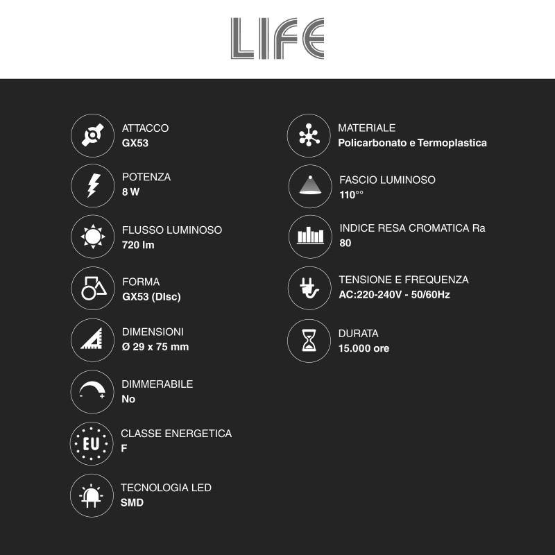 Lampadina LED SMD con attacco GX53 e potenza di 8W. Forma circolare a disco in materiale termoplastico e copertura opaca. Fascio luminoso di 110°, flusso luminoso di 720 lm e rapporto di 90 lm/W. Luce 3in1 da 3000K a 6500K. Classe energetica F e resa cromatica 80. Dimensioni: Ø75x29mm.