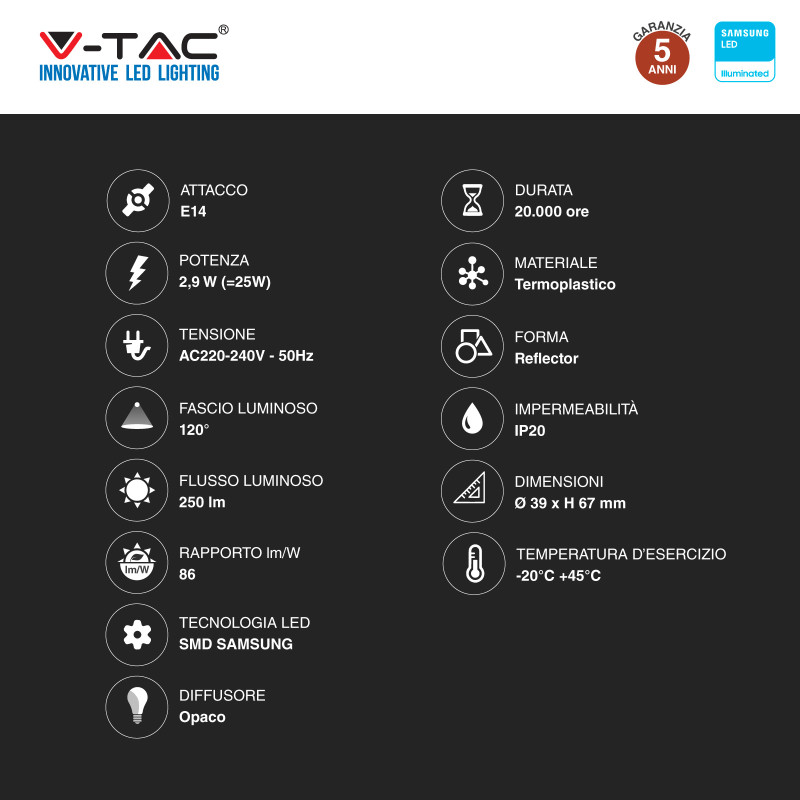 Lampadina LED da 2,9W con attacco E14 e tecnologia LED Samsung SMD. Forma Reflector R39 in materiale termoplastico con copertura opaca. Fascio luminoso di 120°, flusso luminoso di 250 lm e rapporto di 86 lm/W. Disponibile con: Luce Bianca Calda 3000K e Fredda 6500K. Dimensioni: Ø39x67mm.