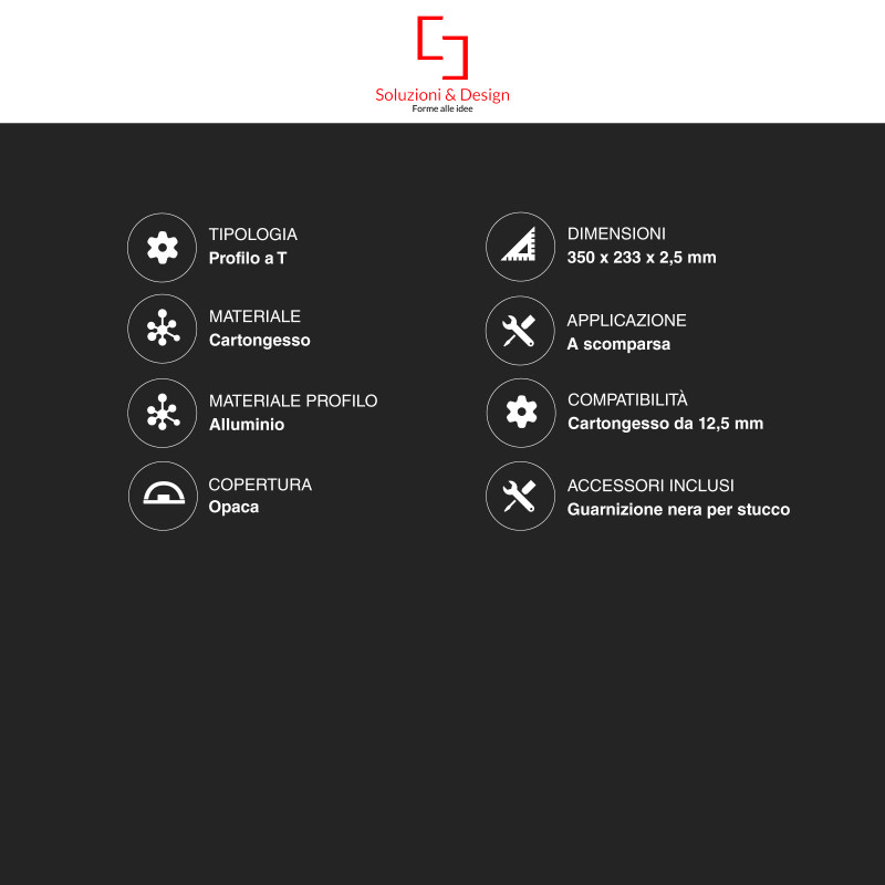 SD Soluzioni & Design SD290.T è un profilo a T in alluminio direttamente integrato nel cartongesso dello spessore di 12,5mm. Ideale per l'installazione, la protezione e la conservazione nel tempo di tutti i tipi di strisce LED con larghezza massima 12,4 mm. Il profilo incassato nel cartongesso risulta facile da installare direttamente sul montante. Con schermatura opaca che consente una trasmissione ottimale della luce, minimizza l'effetto puntinato dei LED. Inoltre è inclusa nella confezione una protezione in gomma per il profilo, che aiuta a mantenerlo pulito e libero da polveri e vernici. SPECIFICHE TECNICHE CONSIGLI CONTENUTO DELLA CONFEZIONE |