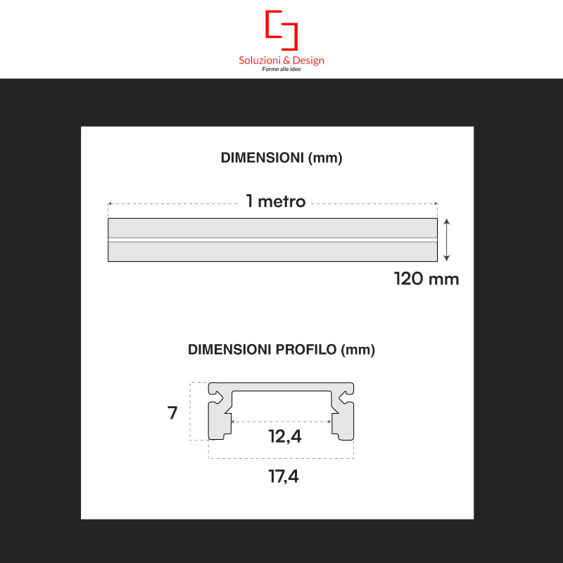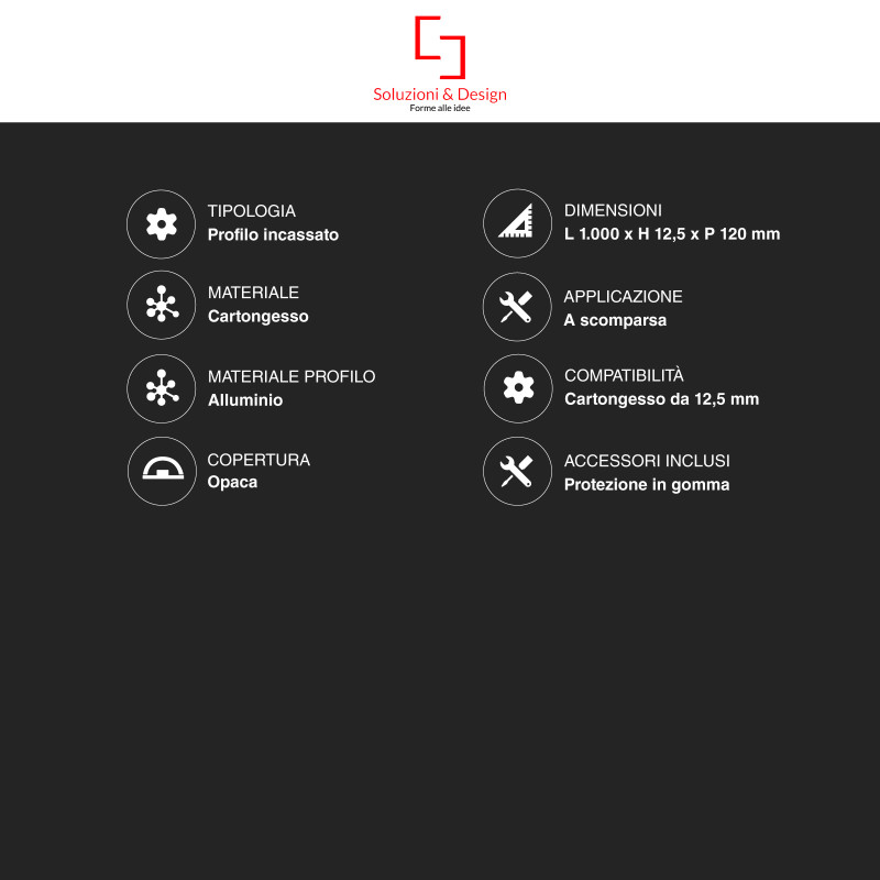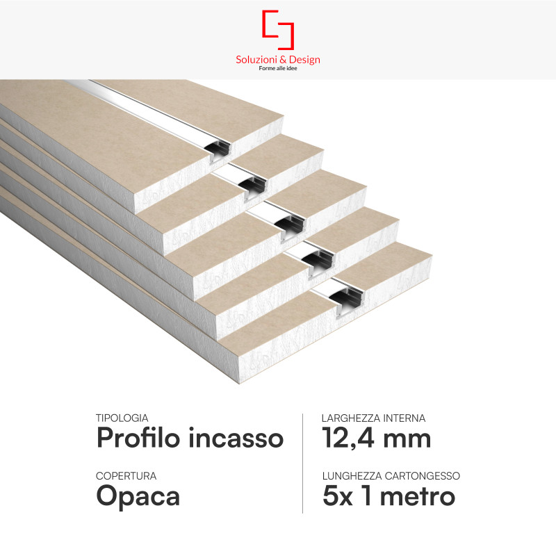 Profili da 1m per strisce LED integrati nel cartongesso. Corpo in alluminio e copertura opaca. Adatti a tutti i tipi di strisce con larghezza fino a 12,4mm. Facili da installare direttamente sul montante. Confezione da 5 profili e guarnizione nera per stucco inclusa. Dimensioni cartongesso: 1000x12,5x120mm. Dimensioni profilo: 17,4x7mm.