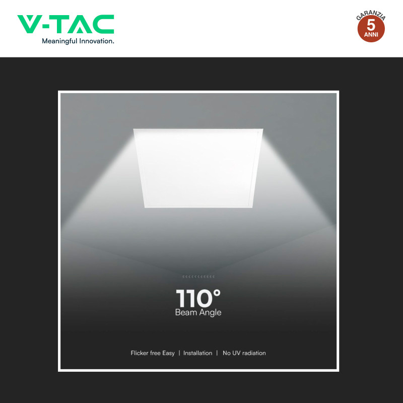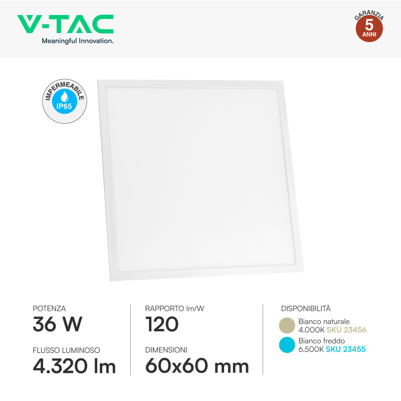 Pannello LED quadrato con potenza di 36W. Fascio luminoso 110°, flusso luminoso di 4320lm e alta luminosità con rapporto di 120 lm/W. Corpo in alluminio e plastica di colore bianco e copertura opaca. Installazione a incasso. Disponibile con: Luce Bianca Naturale 4000K e Fredda 6500K. Classe energetica E e resa cromatica >80. Grado di protezione IP65. Driver integrato e garanzia 5 anni. Dimensioni: 595x595x34mm.