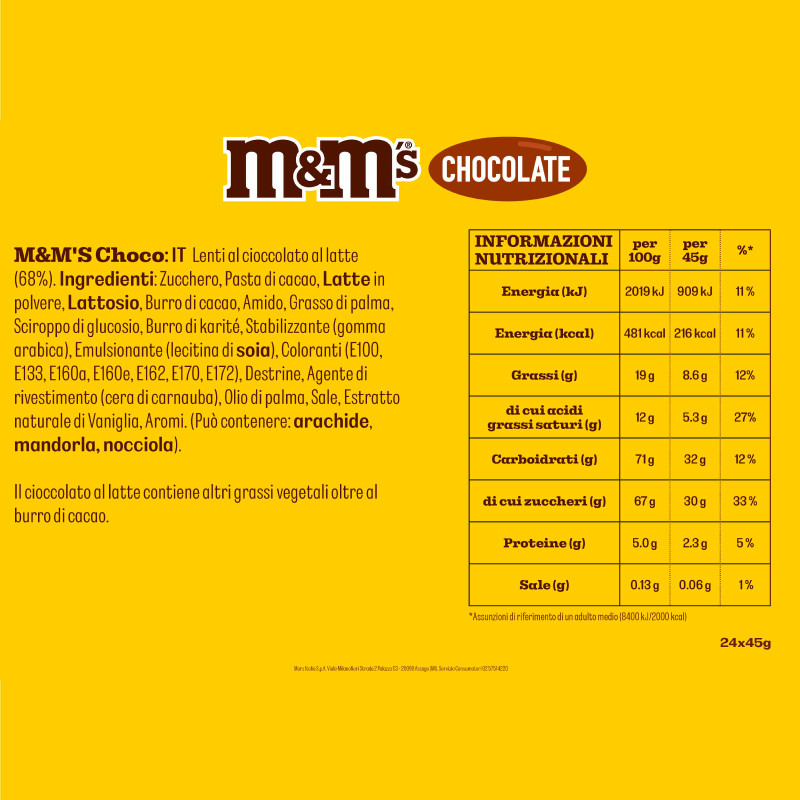 M&M's Chocolate confetti ricoperti e ripieni di morbido cioccolato al latte. Gli inconfondibili ed inimitabili cioccolatini a forma di bottone con la lettera "m" impressa su entrambi i lati. FORMATO |