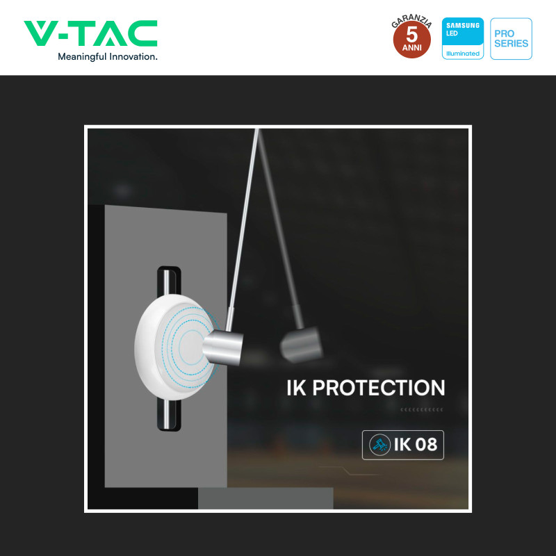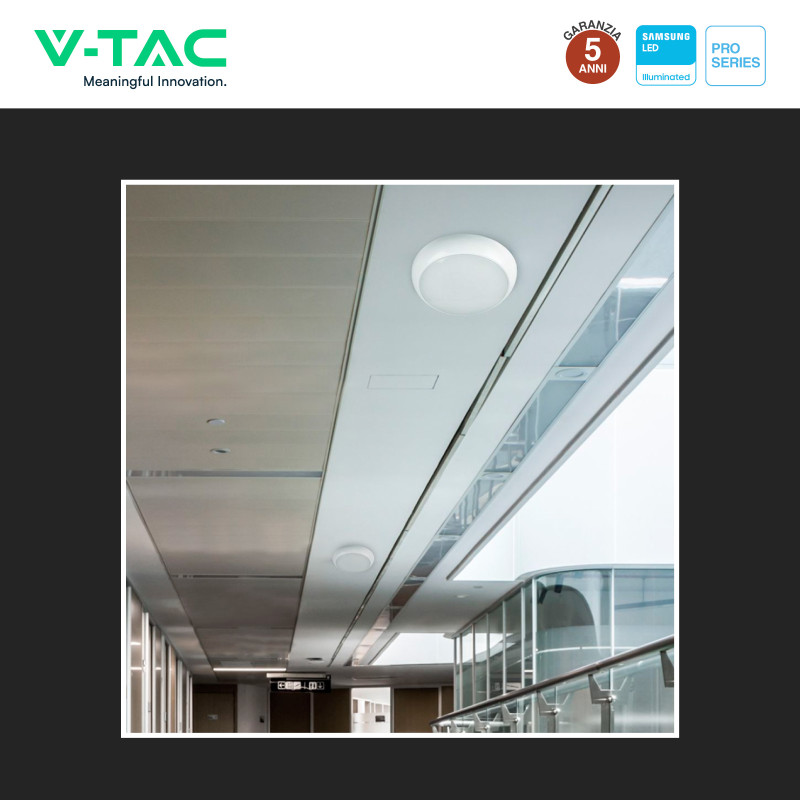 Plafoniera LED SMD con chip Samsung e potenza impostabile fino a 20W. Forma rotonda realizzata in materiale termoplastico di colore bianco con copertura opaca. Fascio luminoso di 110°, flusso luminoso fino a 2600 lm e alta luminosità con rapporto fino a 130 lm/W. Grado di protezione IP65 con certificazione IK08. Installazione a superficie. Garanzia 5 anni. Luce 3in1 da 3000K a 6400K. Classe energetica E e resa cromatica >80. Dimensioni: Ø320x100mm.