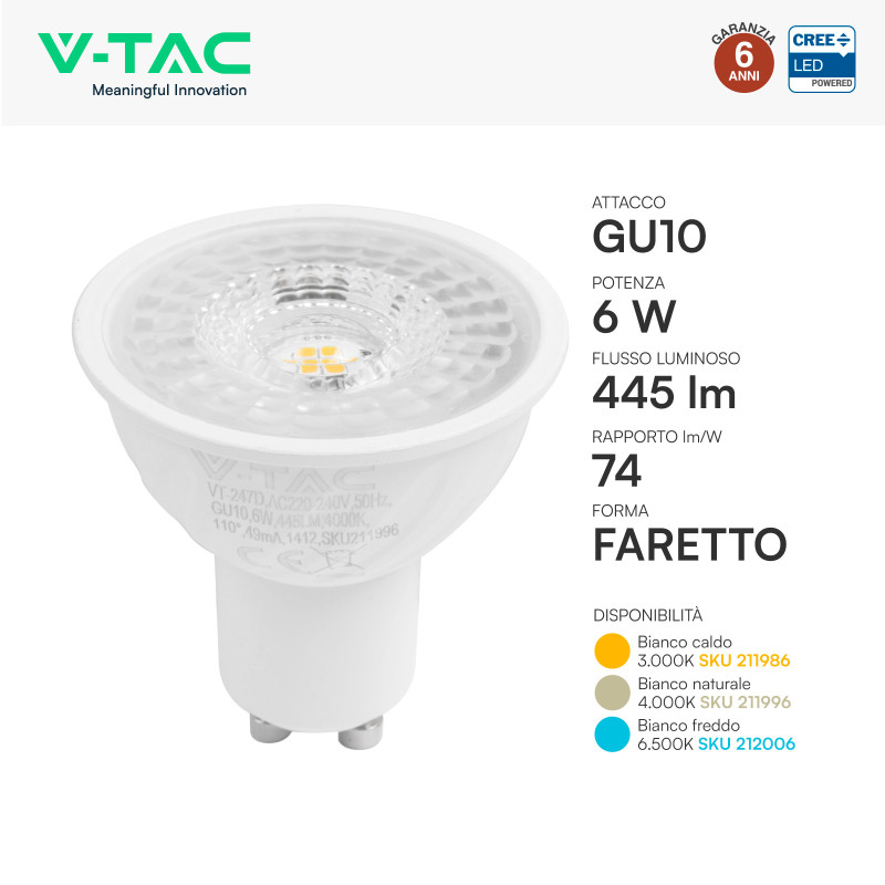 Lampadina LED SMD con chip CREE, attacco GU10 e potenza di 6W. Faretto PAR16 in materiale termoplastico e copertura trasparente. Fascio luminoso di 110°, flusso luminoso di 445 lm e rapporto di 74 lm/W. Disponibile con: Luce Bianca Calda 3000K, Naturale 4000K e Fredda 6500K. Classe energetica F e resa cromatica >80. Garanzia: 6 anni. Dimensioni: Ø50x55mm.