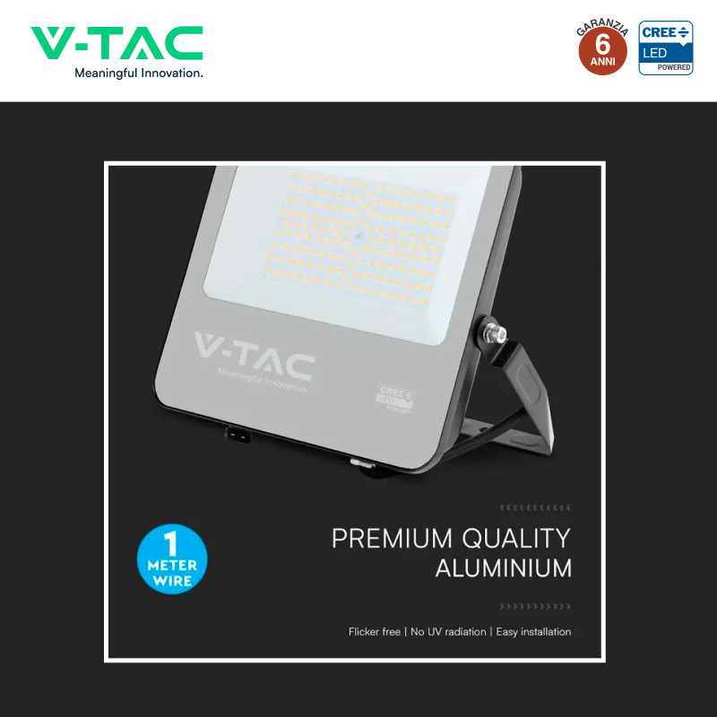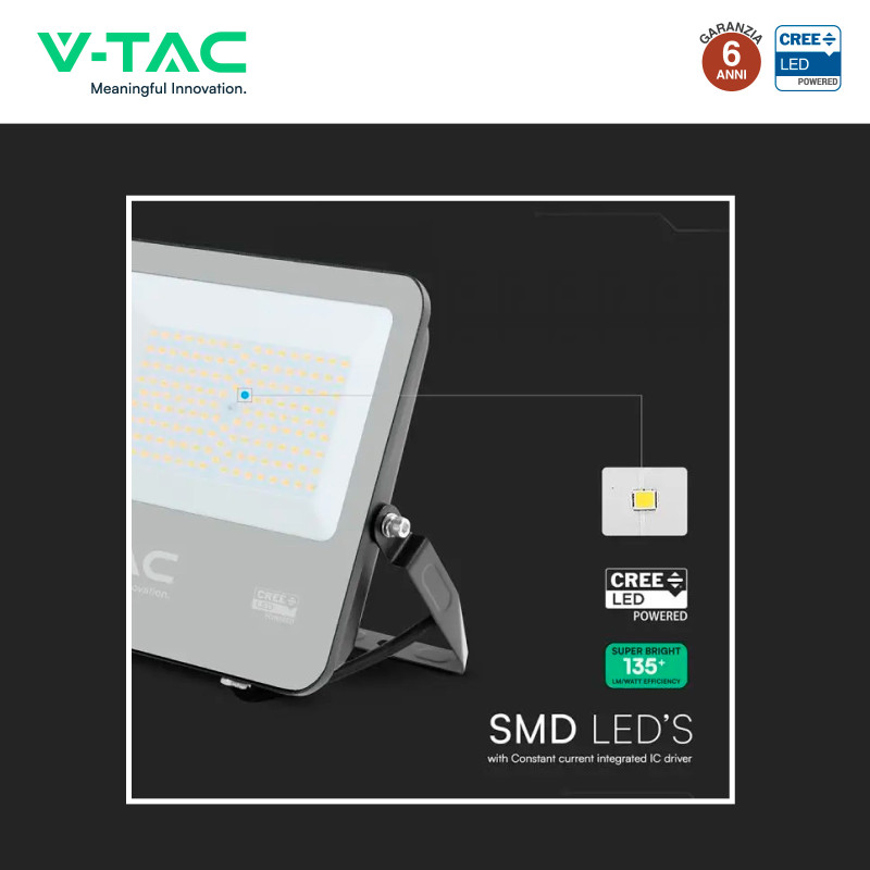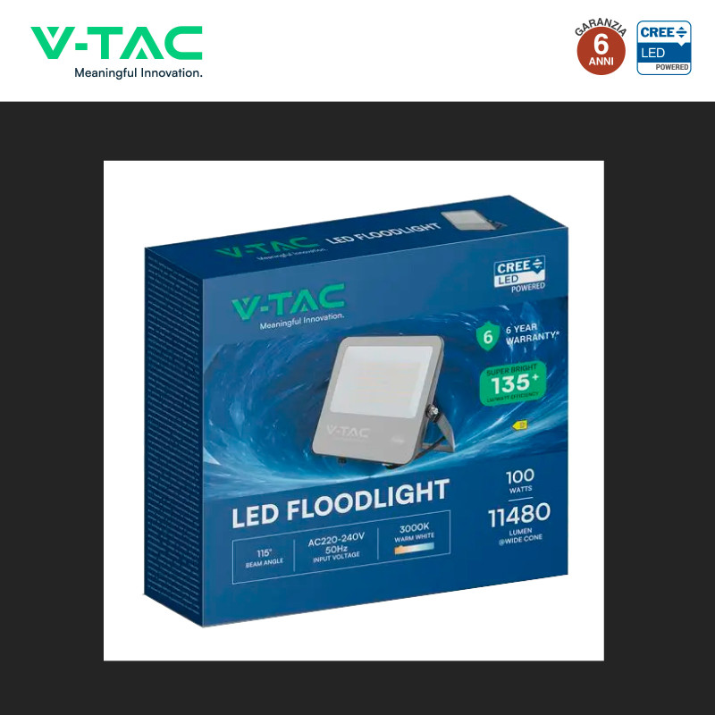 Faro LED SMD con chip CREE e potenza di 100W. Corpo in alluminio di colore nero con copertura opaca. Fascio luminoso di 115°, flusso luminoso fino a 13500 lm e alta luminosità con rapporto fino a 135 lm/W. Grado di protezione IP65. Classe energetica D e resa cromatica 70. Luce Bianca Calda 3000K (11480 lm), Naturale 4000K (11480 lm) e Fredda 6500K (13500 lm). Garanzia: 6 anni. Dimensioni: 256x229x42mm. Lunghezza cavo: 1m.