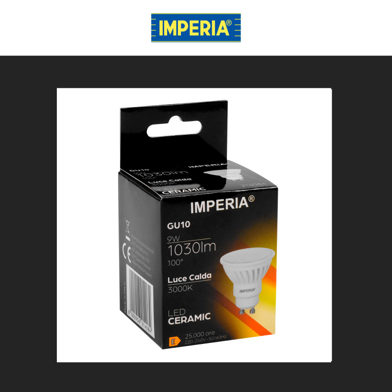 Lampadina LED con attacco GU10 e potenza di 9W. Forma Faretto PAR16 in ceramica con copertura opaca. Flusso luminoso di 1030 lm e alta luminosità con rapporto di 114 lm/W. Disponibile con: Luce Bianca Calda 3000K e Naturale 4000K . Classe energetica E e resa cromatica 80. Dimensioni: Ø50x55mm.