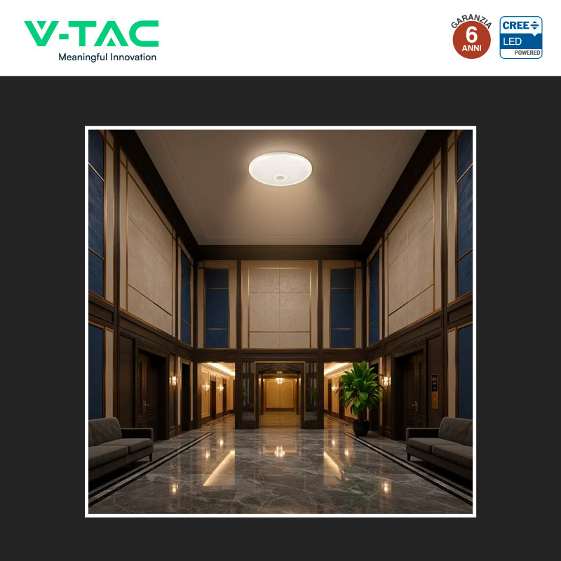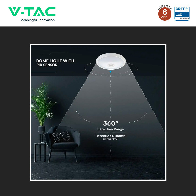 SPECIFICHE TECNICHE • Forma: Rotonda • Potenza: 12W • Tecnologia: LED CREE SMD • Tensione: AC 220-240V • Frequenza: 50/60 Hz • Fascio luminoso: 120° • Flusso luminoso: 1000 lm • Efficienza luminosa: 83 lm/W • Classe efficienza energetica: F • Dimmerabile: No • Colore: Bianco • Copertura: Opaca • Grado di protezione: IP20 • Installazione: A superficie • Dimensioni: Ø 290 x 59,5 mm • Sensore crepuscolare: Si (regolabile) • Sensore di movimento: Si (regolabile) • Distanza di rilevamento: Max 6 m • Altezza installazione: 2,2 - 4 m • Garanzia: 6 anni