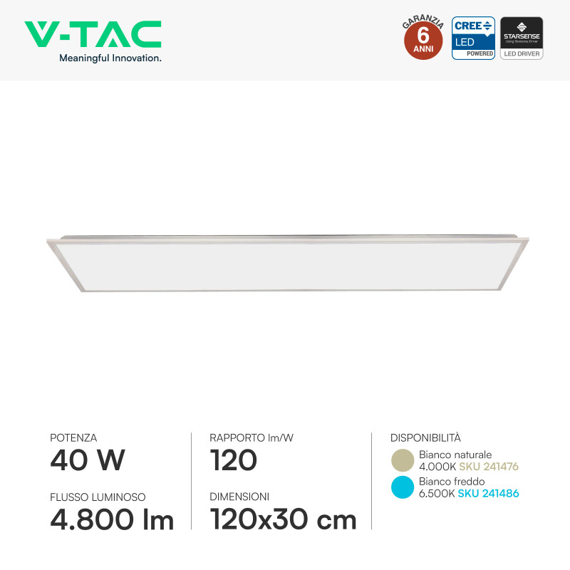 Pannello LED rettangolare con potenza di 40W e tecnologia LED CREE SMD. Fascio luminoso di 110°, flusso luminoso di 4800 lm e alta luminosità con rapporto di 120 lm/W. Corpo di colore bianco in Fe e PS con copertura opaca. Installazione a incasso. Disponibile con: Luce Bianca Naturale 4000K e Fredda 6500K. Classe energetica E. Driver Starsense incluso. Garanzia 6 anni. Dimensioni: 1195x295x33mm.