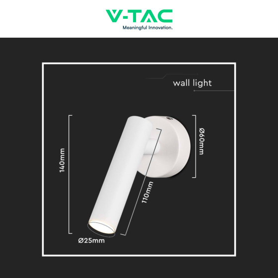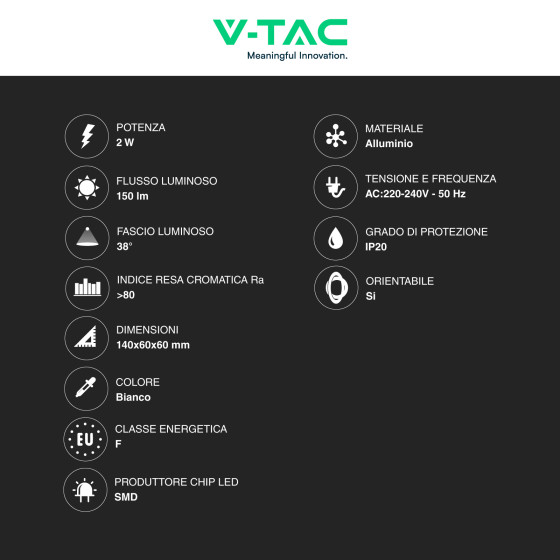Lampada LED da muro con potenza di 2W e tecnologia LED SMD. Corpo in alluminio di colore bianco. Fascio luminoso di 38°, flusso luminoso di 150lm e rapporto di 75 lm/W. Disponibile con: Luce Bianca Calda 3000K e Naturale 4000K. Classe energetica F e resa cromatica >80. Faretto orientabile, ideale per la lettura e nelle camere d'albergo. Dimensioni: 140x60x60mm.